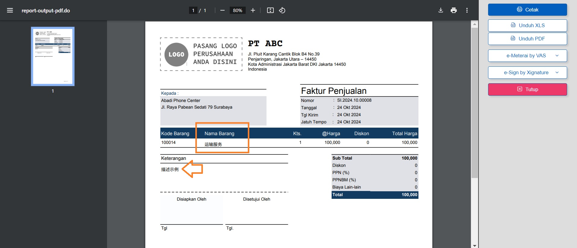 - Simpan Desain Cetakan tersebut dan berikut tampilan Desain Cetakan dengan Bahasa Mandarin untuk Nama Barang dan Keterangan di Dokumen Faktur Penjualan.