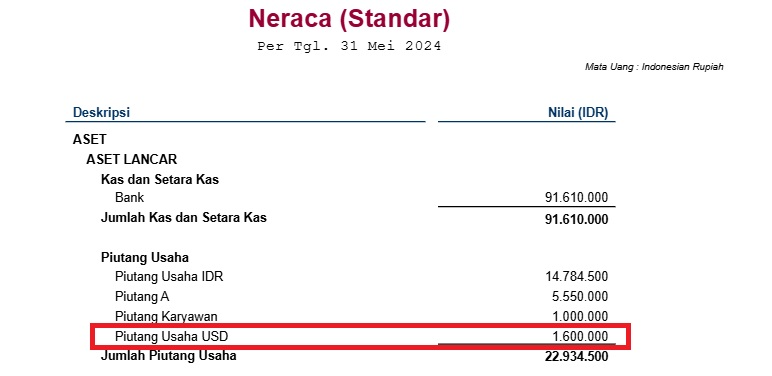 - Saldo Piutang IDR di Laporan Neraca per 31 Mei 2024 = Rp 22.934.500 – (Rp 10.000.000 + Rp 1.600.000 + Rp 1.000.000), maka didapat nilai sebesar Rp 10.334.500.