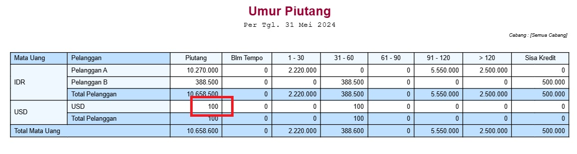 Laporan Umur Piutang untuk Nilai Piutang USD