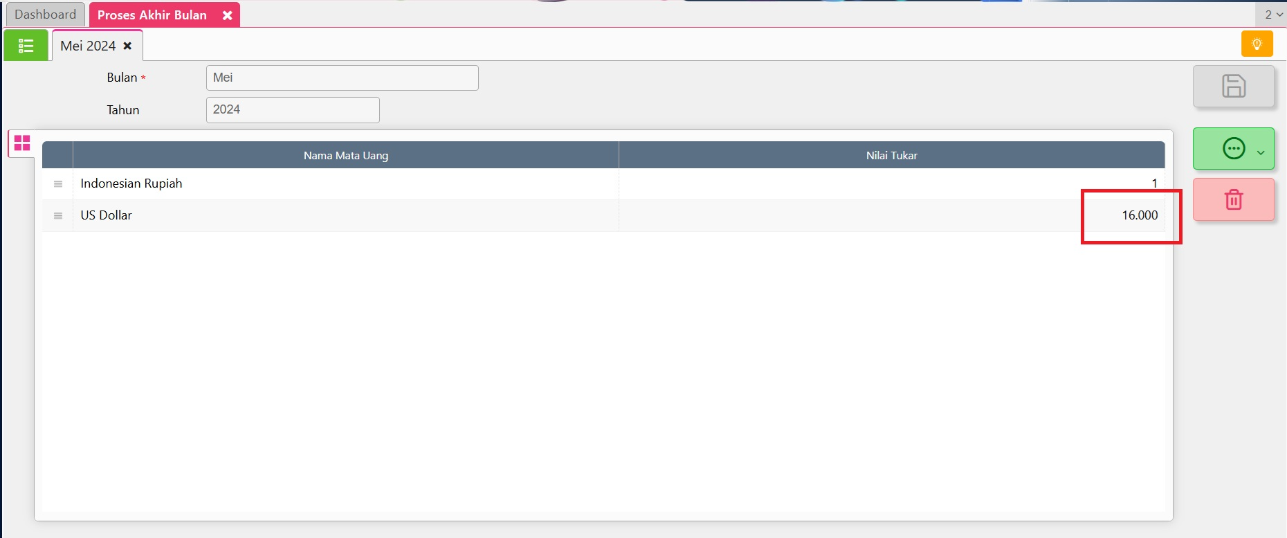 - Hitung nilai piutang dalam mata uang asingnya dengan cara membagi nilai saldo akun piutang mata uang asing dengan nilai tukar yang digunakan saat melakukan proses akhir bulan. Pada ilustrasi, nilai saldo akun Piutang USD yang tampil pada Laporan Neraca per 31/05/2024 adalah sebesar Rp 1.600.000 dan nilai tukar pada proses akhir bulan Mei 2024 adalah sebesar Rp 16.000 maka didapat nilai sebesar USD 100 (Rp 1.600.000/16.000).